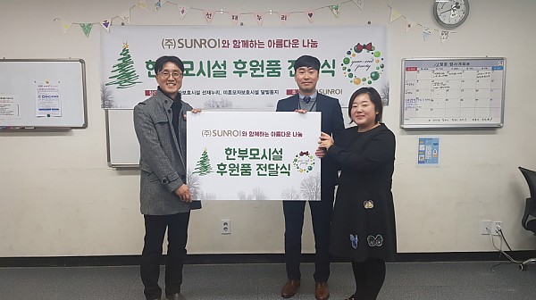 ◎ 내 용 : 화장품 및 바이오제조 전문기업 (주)SUNROI는 연말연시를 맞이하여 지역사회 소외계층에게 아름다운 나눔을 실천하기 위하여 시가 약 1억 5천만원 상당의 자사 판매 화장품 세트 후원물품을 선재누리 및 진각복지재단 산하시설에 전달하였습니다.
