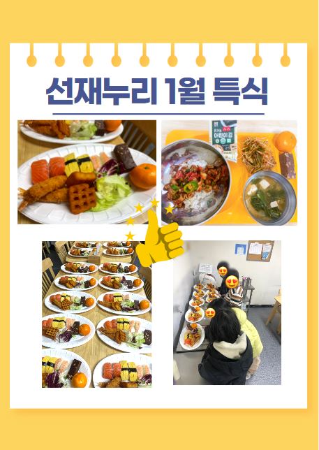 선재누리 1월 특식 작성자 선재누리 작성일23-01-17 10:30 조회403회 댓글0건 이전글 다음글 목록 본문 ★기간: 2023년 1월 16일 (매월 15일) ★장소: 선재누리 식당 ★대상: 선재누리 입주자 ★내용: 한 달에 한 번 입주자분들께 인기있는 외식메뉴를 구성하여 평상시와는 다른 메뉴로 입과 눈이 즐거운 식사 시간이 되실 수 있도록 특식을 제공해드리고 있습니다! 감사합니다 ^^ 댓글목록 등록된 댓글이 없습니다. 이전글 다음글 목록