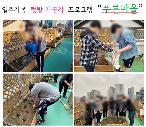 선재누리에서는 입주가족이 식물을 가꾸며 심리·정서적 안정을 갖고 아버지와 자녀가 함께 텃밭을 가꾸며 유대관계를 증진하기 위해 ‘푸른마을’ 프로그램을 실시하고 있습니다. 또한 텃밭 가꾸기를 통해 6층 공간이 싱그러운 식물들로 새롭게 디자인되어 쾌적한 선재누리 생활을 도모 할 수 있었습니다.