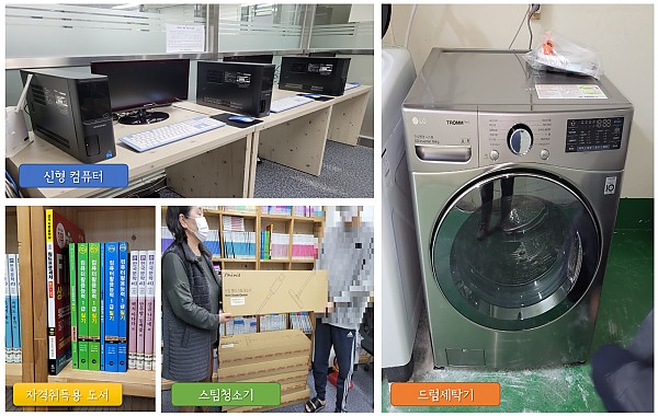 또한 워드프로세서와 컴퓨터활용능력 1급 자격 취득을 돕기 위한 도서를 구비하였으며 입주가족 생활실의 깨끗한 관리를 위해 스팀청소기를 제공해 드렸습니다.