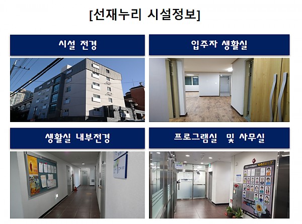 - 선재누리는 2014년에 개원하였으며 서울시 한부모시설 중 최고수준의 주거환경을 보유하고 있는 쾌적한 시설입니다.