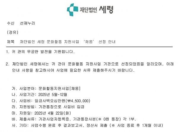 2025년 재단법인 세령 문화활동 지원사업 '채움' 선정 작성자 선재누리 작성일25-04-16 12:19 조회149회 댓글0건 이전글 다음글 목록 본문 ‘재단법인 세령’의 문화활동 지원사업에 한부모부자가족복지시설 ‘선재누리’가 선정되었습니다, 덕분에 지원금 4,500,000원으로 입주아동을 위한 다양한 프로그램(워터파크, 박물관, 학습지도 등)을 실시할 수 있게 되었습니다! 다시 한 번 재단법인 세령 이사장님과 관계자 분들께 감사인사드립니다~! 댓글목록 등록된 댓글이 없습니다. 이전글 다음글 목록